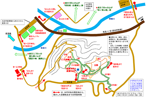 主郭は見晴らしがよく、三河(北条、今川、松平、三宅)、中馬街道(織田、森)、信濃(武田、真田)等の動きをいち早く見える絶好の場所である。